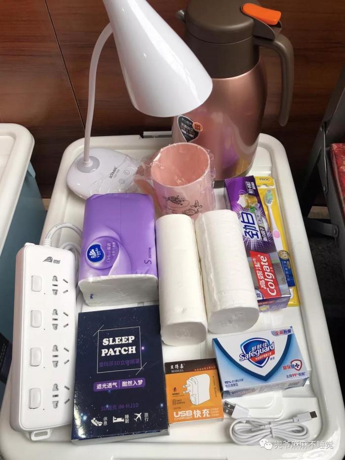 摆开来看,有牙刷牙膏水杯,卷纸,抽纸,香皂,接线板,保温壶,充电器,眼罩耳塞,小台灯,拖鞋,毛巾,盆子,一共13件。
