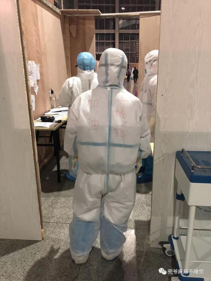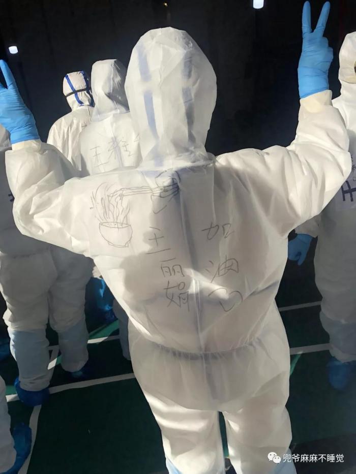 然后在外层防护服的胸前或者背后都会用笔写上,来自的地区和医院名,是医生还是护士,自己的姓名。