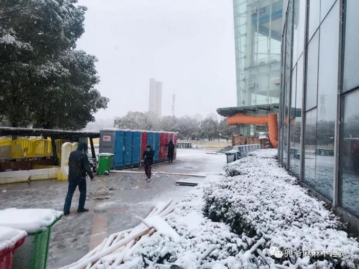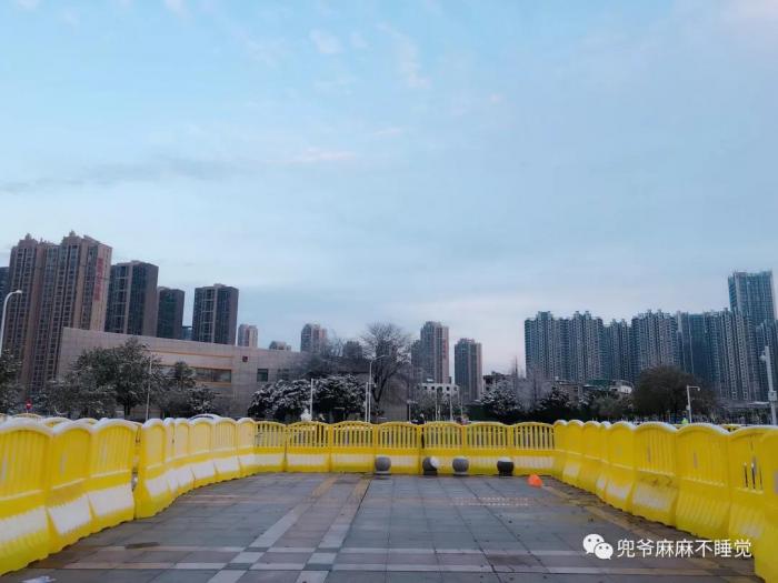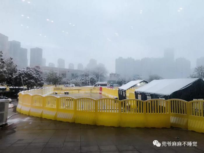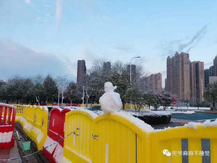 应该是在方舱门口执勤的工作人员,在积雪以后堆了个小雪人在防护栏上,莫名的小确幸。
