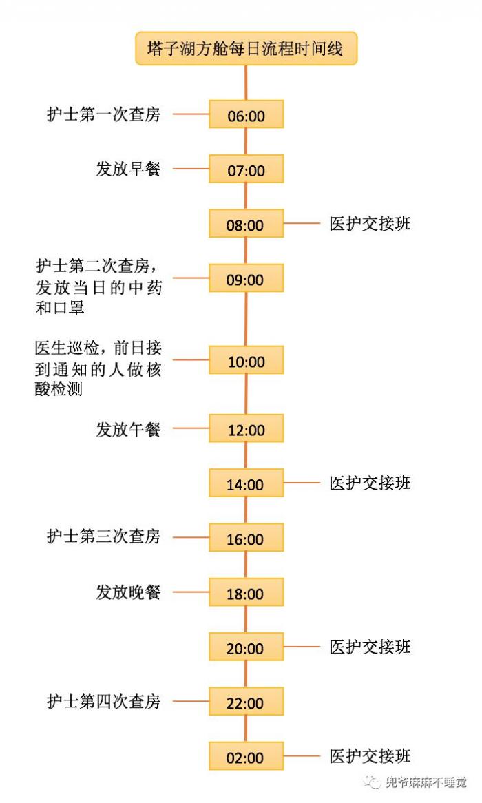 这里的医护人员每个团队是隔一天排一次班。每天4班倒,6小时一班,交接时间依次是8点,14点,20点,2点。