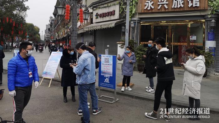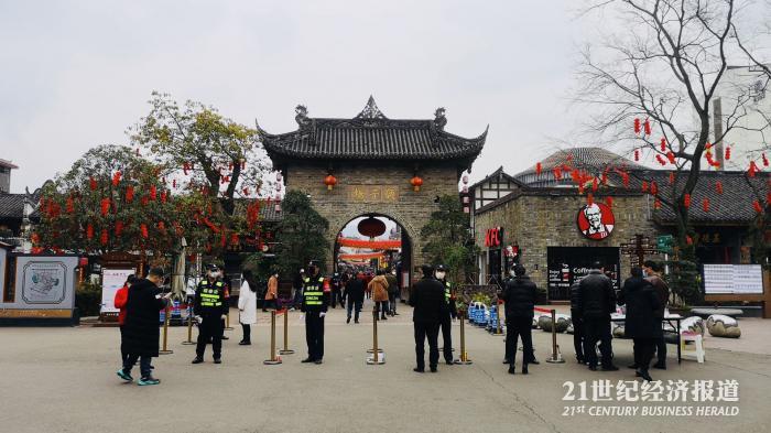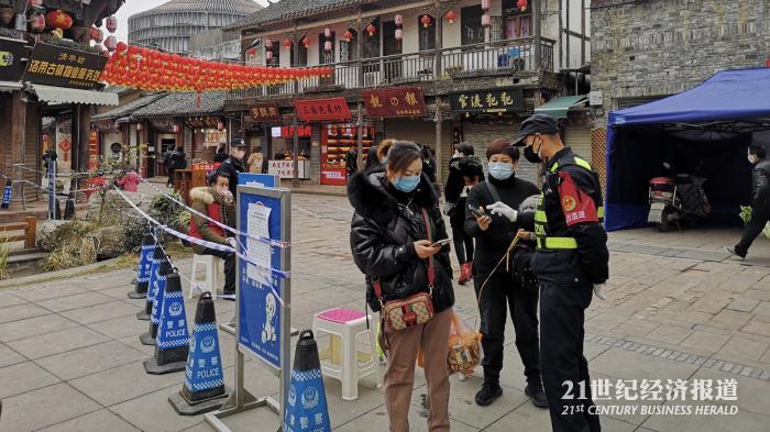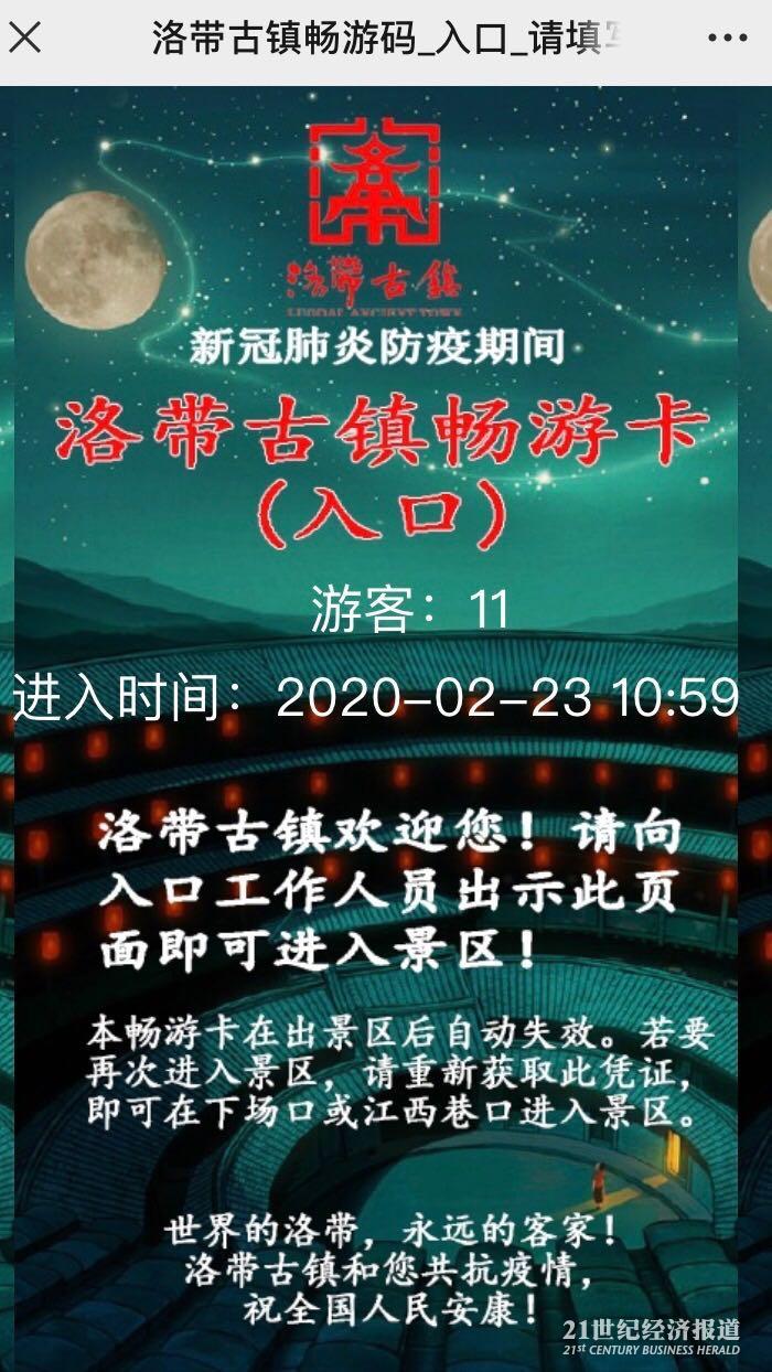 2月22日是洛带古镇恢复开放的第三天。当日12时,在进入景区前的门口已经有不少游客在有序入场。21世纪报道记者注意到,进入前,游客需测量体温,并通过微信小程序申报健康状况和个人信息,此后该小程序将生成一张包含游客信息的电子凭证,进出景区皆需要该凭证。