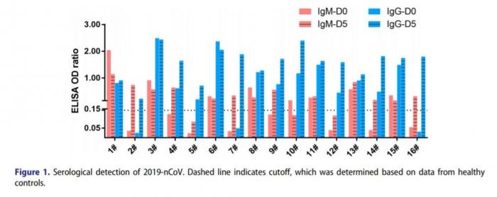 近日,一篇发表于国际期刊《新发微生物与感染(Emerging Microbes & Infections)》2020年第九期的文章称,研究针对16位入院接受药物治疗约十天的新冠肺炎患者进行了血清检测,发现在首次采样当天,患者体内的IgM和IgG滴度都相对较低或无法检测出来;到了第5天,几乎所有患者都可以看到病毒抗体的增加,IgM阳性率从50%增加到81%,而IgG阳性率从81%增加到100%。