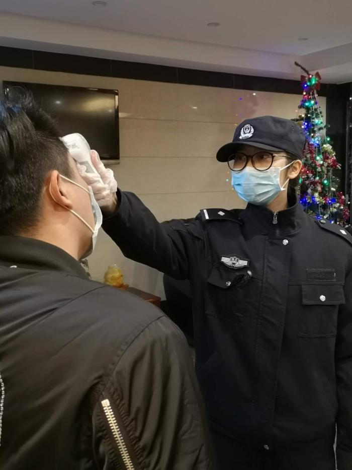 “真正让我下定决心留在潜江抗疫的是园林派出所同学朱俊妍的一则消息,说一名女辅警牺牲在抗疫途中。我当时就哭了,觉得战友们都在一线拼搏,而我还呆在安乐窝。全国都在抗疫,既然不能和队友并肩,与家乡同行一起战斗也是一样的。我的想法得到了大队领导的支持,但父母怕有危险,叫我就留在小区帮助物业做点力所能及的事。我以志愿者的身份劝小区人不要外出,在门口检查登记外出人员,测体温。但有很多人不配合,工作不方便。我想应该公开身份,参加潜江警方行动更好些。于是就近参与园林派出所城北警队防疫工作,顺便找朱洪波队长借了一套警服。一旦投入工作,连日来压抑不安的心情一扫而光。”