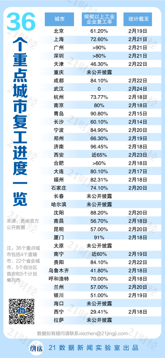 注:本文复工率数据来自各地官方最新发布的规模以上工业企业复工率数据,如有遗漏错误请联系xiezhen@21jingji.com,zhangnan@21jingji.com。