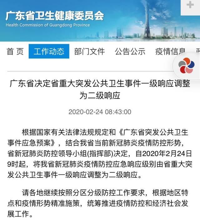 根据国家有关法律法规规定和《广东省突发公共卫生事件应急预案》,结合广东省当前新冠肺炎疫情防控形势,省新冠肺炎防控领导小组(指挥部)决定,自2020年2月24日9时起,将广东省新冠肺炎疫情防控应急响应级别由省重大突发公共卫生事件一级响应调整为二级响应。