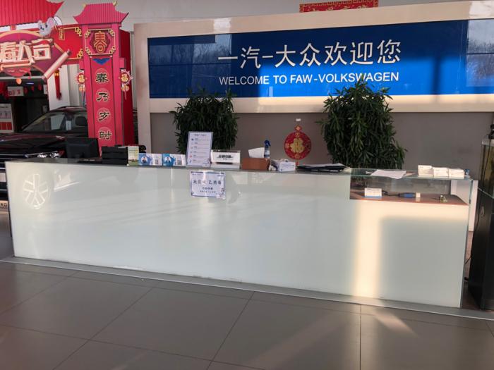 (一汽-大众经销商店内,前台无值守人员,标注“此区域已消毒”)