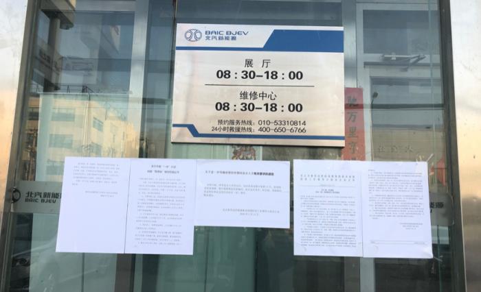 (北汽新能源展厅正门玻璃上贴满相关部门关于疫情期间的注意事项和公告)