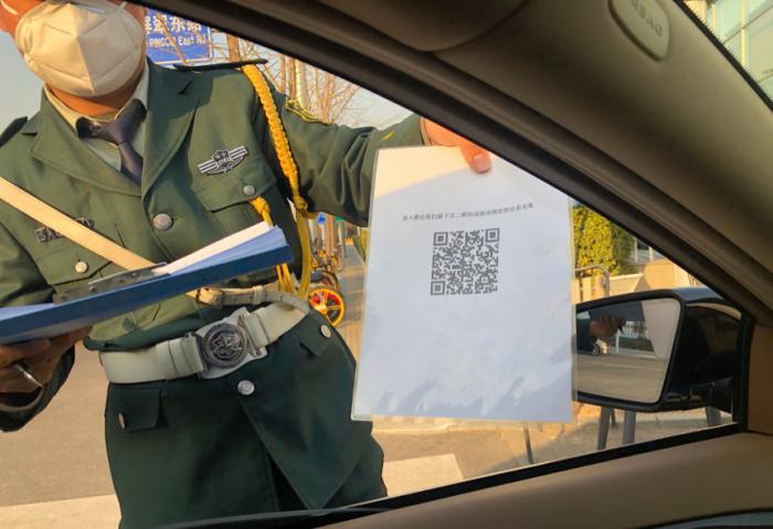 (宝马经销商保安向记者出示二维码,要求填报防疫防控信息)