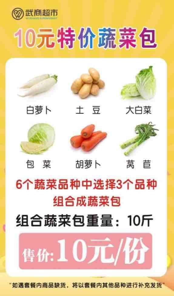 首先是面向低收入群体推出“特价蔬菜包”,每个“特价蔬菜包”售卖10元,品种至少包括3种以上(白萝卜、胡萝卜、土豆、大白菜、卷心菜等蔬菜中选择),重量为10斤。社区可有组织团购代购,重点保障辖区低收入群体购买。商家进销差价部分由政府按“一元菜”的相关政策给予财政补贴。