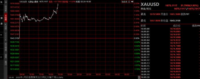 疫情在全球范围内蔓延,韩国病例大增,23日新增161例感染新冠病毒的确诊病例,累计763例,新增1例死亡病例,累计7例。 上周五美国股市出现明显的调整,种种风险推升黄金价格,2月24日亚洲交易时段,黄金一度突破1679.2美元/蛊司,涨幅已经超过2%,再次刷新7年新高。 资金涌香黄金投资,全球最大的黄金ETF——SPDR的持仓规模已达923.99吨,连续6日加仓,持仓量处于近三年的高位。唱多黄金的分析一片,道明证券表示,推动金价上涨的不仅仅是避险需求。黄金还有更多上涨空间,这个牛市才刚刚开始。
