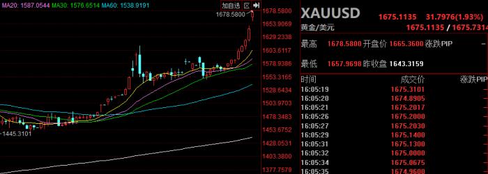 周一现货黄金开盘便快速约上1660美元/盎司,截至目前最高冲至1679.2美元/盎司,距离1700美元/盎司只有咫尺之遥。