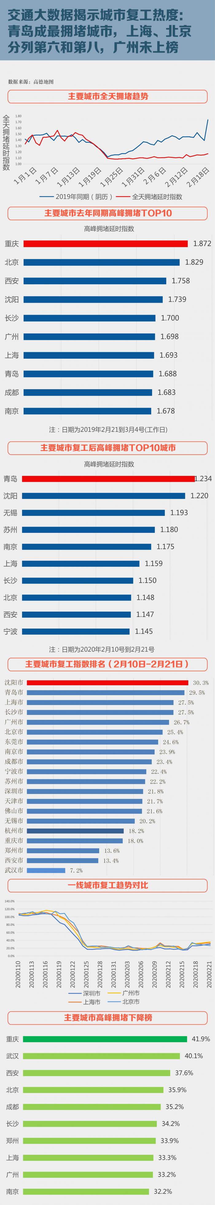 在复工后拥堵排名前十的城市中,青岛、沈阳、无锡位列前三,而去年同期排名前三的是重庆、北京、西安。