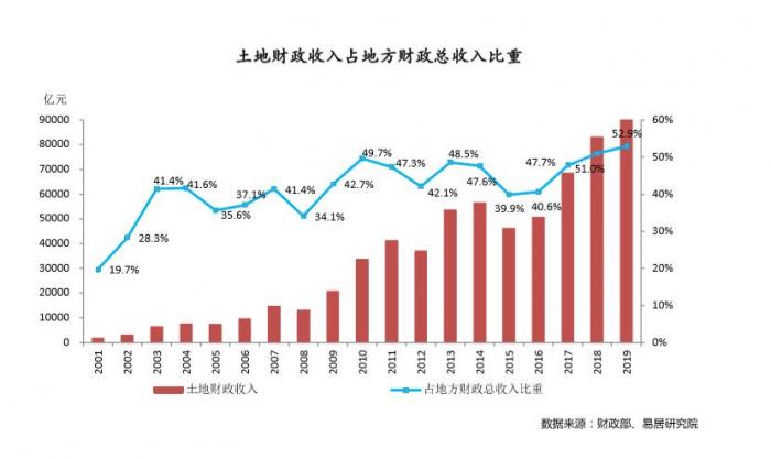 2月25日,上海易居房地产研究院发布《2019年地方政府对土地财政的依赖度报告》称,以房地产“五税”加土地出让金的口径来计算,2019年“土地财政”依赖度近53%,房地产税收及土地出让金收入占地方财政收入比重创新高,同比增速回落。