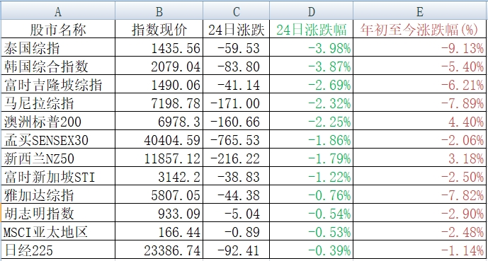 虽然24日上证指数微幅调整,但深证成指、中小盘指、创业板指等均再创本轮行情新高。从今年以来的表现来看,A股也是领跑全球。年初以来,亚太主要股市几乎全部呈现下跌局面,这从上面的表格可以看出。
