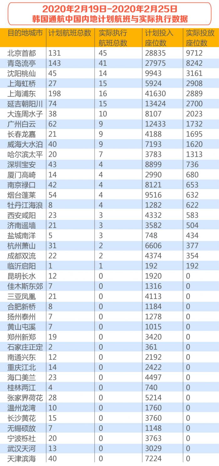 目前中韩之间通航量最大的两个城市分别是北京和青岛,过去一周分别有45和41个航班执飞,实际投放座位数是9712和8242个。也就是说,如果所有航班100%满座的话,则过去一周有近1.8万人从北京和青岛的机场进出韩国各地。除了这两个城市外,其他20个城市过去一周最多有2.58万人韩国过来。不过,这些数据是基于这些航班满座的情况下,值得一提的是,过去一周中国民航状况依然低迷。大多数航班客座率在四五成左右,甚至更低。