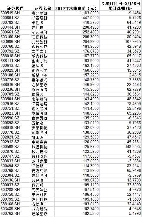 记者注意到,截至2018年12月31日,两市仅有6只“百元股”,分别为贵州茅台、长春高新、吉比特等老面孔。而在一年以多前的2019年2月1日,两市的百元股数量也只有7只。也就说,在最近一年左右的时间里,两市“百元股”的数量暴增了近10倍。