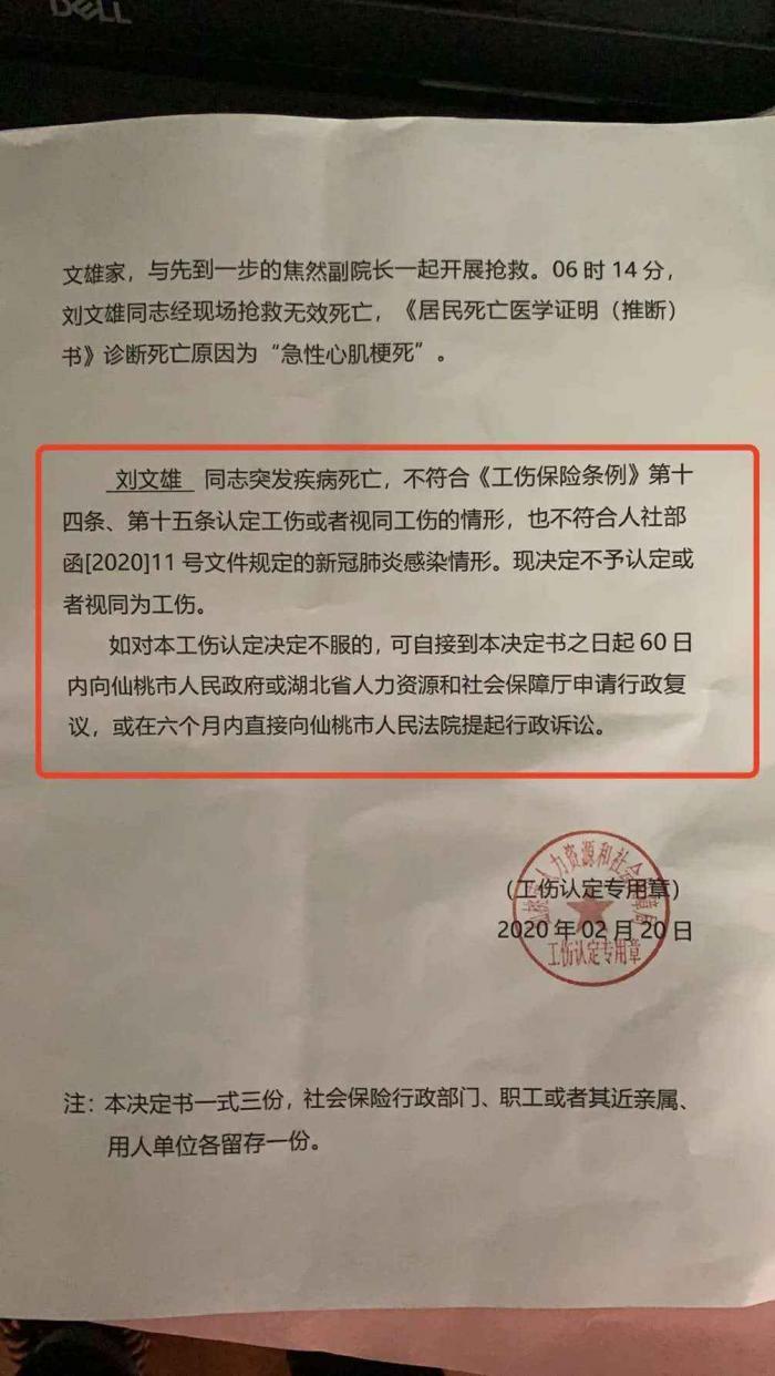 记者此前报道,2月13日5时30分许,仙桃市三伏潭镇卫生院医生刘文雄在家中突发疾病并晕厥,后抢救无效死亡,诊断死亡原因为“急性心肌梗死”。仙桃市人社局出具的《不予认定工伤决定书》称,不予认定或者视同为工伤。