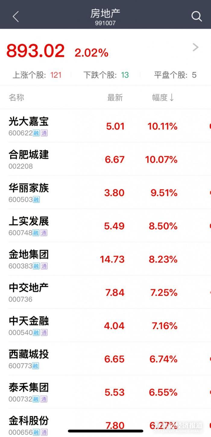 在房地产股中,光大嘉宝(600622.SH)、合肥城建(002208.SZ)涨停,华丽家族(600503.SH)、上实发展(600748.SH)逼近涨停,而139只个股中122只上涨,5只平盘,下跌个股仅12只。