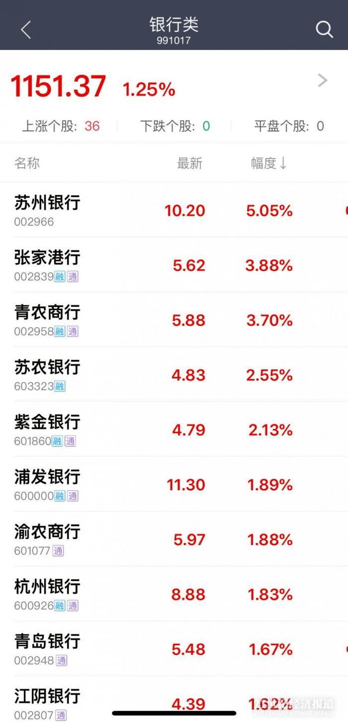 而银行股也出现普涨。银行板块,36家银行股票均上涨,次新股表现比较抢眼。苏州银行(002966.SZ)领涨,涨幅5.26%。张家港行(002839.SZ)、青农商行(002958.SZ)涨幅均超过3%。