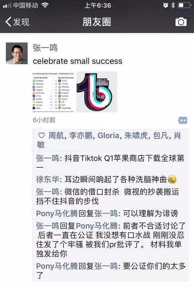 很多人应该还记得2018年5月,字节跳动创始人张一鸣和腾讯集团董事会主席马化腾在朋友圈围绕“封杀”话题进行的口水战。当时的背景正是张一鸣在朋友圈庆祝TikTok成为当年Q1苹果商店下载全球第一。