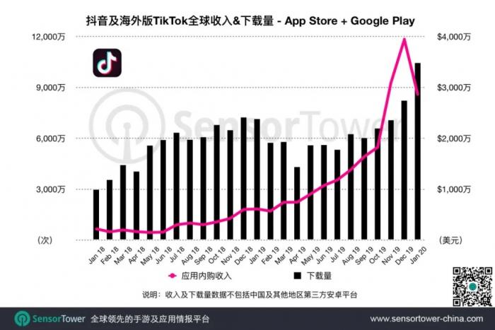 需要指出的是,抖音及TikTok 1月分的收入较去年12月出现了回落,2019年12月,抖音及TikTok的全球收入为3940万元,这也是截至目前为止,抖音及TikTok 单月收入的最高纪录。