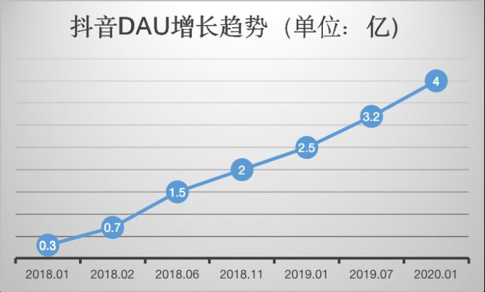 过去几年,抖音在国内市场实现了高速增长。从2016年9月第一个版本上线开始,其用户体量就开始呈现出火箭式增长:2018年1月,DAU为3000万;2018年2月7000万;2018年6月1.5亿;2018年11月2亿;2019年1月2.5亿;2019年7月3.2亿;2020年1月则突破了4亿。