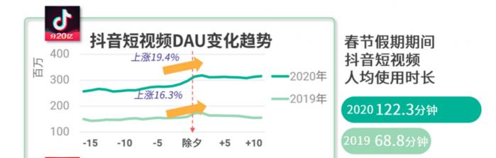 从极光发布的《2020年春节移动互联网行业热点观察研究报告》亦能看出,抖音在春节期间的日均DAU维持在3亿左右,较去年同期及春节之前有明显增长。从用户人均使用时长来看,抖音在春节期间的数据为122.3分钟,去年同期为68.8分钟。可对比的是,在“优爱腾”三大在线视频平台中,腾讯视频春节期间的人均使用时间是最长的,为100.5分钟。