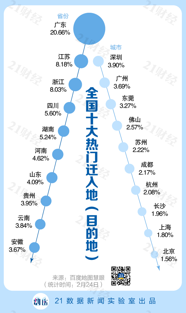 21数据新闻实验室根据百度迁徙地图数据显示,2月17日以来,广东、江苏、浙江包揽了人口迁入省份前三,其中,广东迁入比例始终在20%左右。