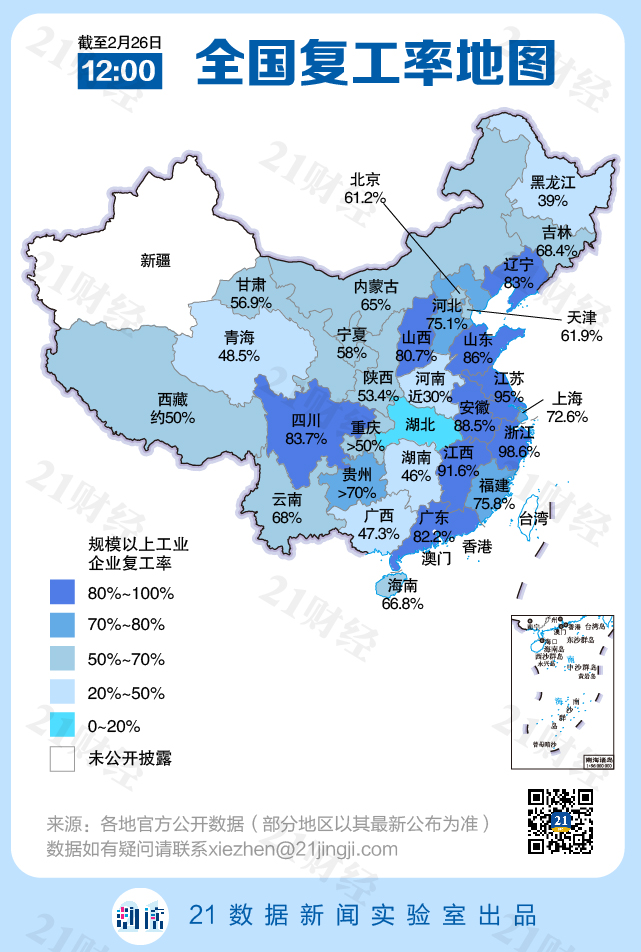 注:本文复工率数据来自各地官方最新发布的规模以上工业企业复工率数据。数据如有遗漏错误,请联系xiezhen@21jingji.com,zhangnan@21jingji.com