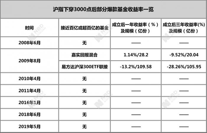 再来看下穿3000点爆款基金的表现。刚刚下穿3000点的时候,此时发行新基金,虽然市场的热度还在,不至于陷入冰点,但是却已经很难有百亿规模。记者统计了上述下穿时间段基金的成立情况,成立规模在百亿以上的爆款基金只有零星几只: