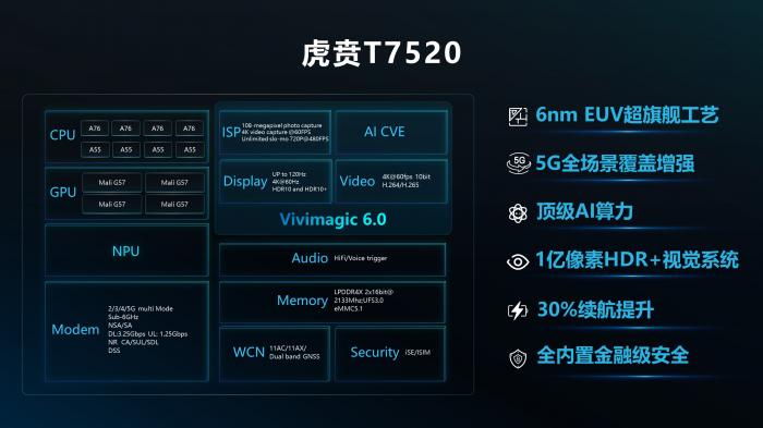 紫光展锐首席执行官楚庆在线上发布会中介绍道,虎贲T7520在技术工艺、通信能力、AI、视觉能力、续航能力,安全性六大方面具有优势。