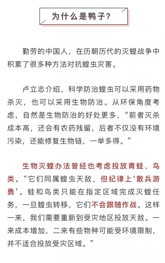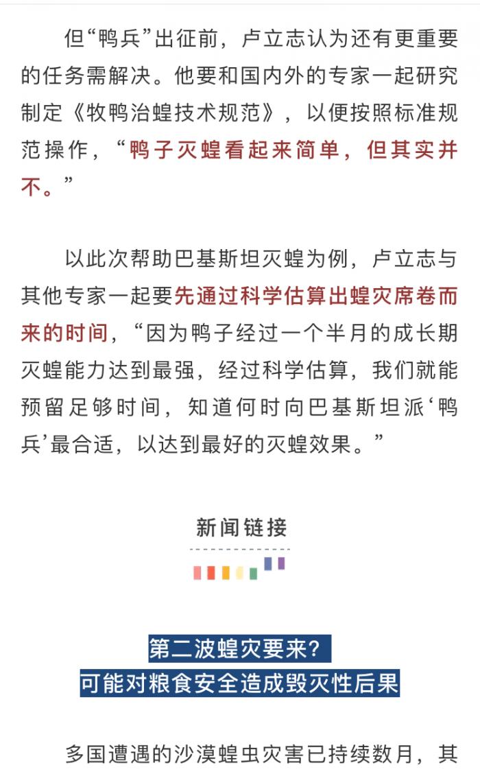 2月27日下午央视消息,中国蝗灾防治工作组回应:从目前情况来看,在巴基斯坦不适合以鸭子捕食蝗虫的方法。中国自古就有牧鸭治蝗,但效果有限。用鸭子来治理蝗虫是一些中国专家做的探索性课题,暂时没有进入政府援助方案。
