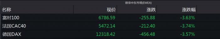 欧洲股市跌幅更大,富时100、法国CAC40、德国DAX指数跌幅均超过3%。这一跌幅,已经超过了本周一海外新冠疫情蔓延后的首日回落幅度。
