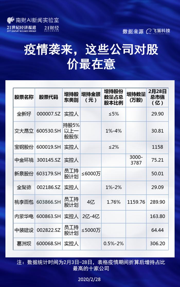 增持公告主要分为限定增持金额、限定增持股份比例,限定增持数量以及限定增持价格四大类,南财AI新闻实验室研究员将四大类统一折算成增持股份数量占总股本比例,最后得出增持最为积极的十家上市公司,形成以上表格。其中,预计增持股份占总股本最高的是全新好(000007.SZ),预计占到总股份5%。其次是交大昂立(600530.SH),而央企巨无霸宝钢股份(600019.SH)大股东也加入了增持行列,最高增持不超过总股本2%,用2月28日收盘股价计算,意味着投入金额最多可能回达到23亿元。