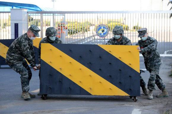 韩国某部队正门前,官兵们设置路障防疫(韩联社)