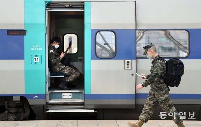 疫情加重,韩国军人戴口罩出行(《东亚日报》)