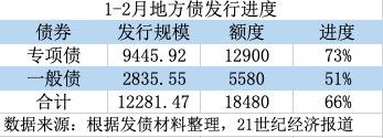 2.1-2月发行进度达66%,相比去年同期提升16个百分点。专项债发行进度更是高达73%。