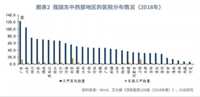 除了医疗资源总量不足之外,我国当前的医疗资源分布也存在一定的问题。由于人口分布、经济实力等问题,我国东中部地区三甲医院总量显著高于西部偏远地区。同时,就三甲医院的质量来看,东部地区顶级百强医院占据69席,而中西部则只有19家和12家,东部地区整体医疗水平显著高于中西部地区。