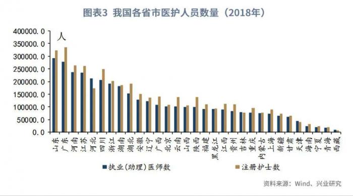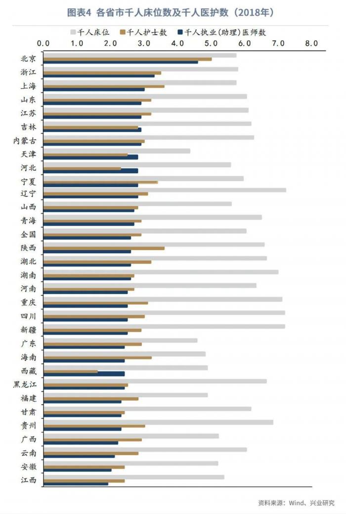 与医院数量相对应的,是东中部地区的人均医护人员数量显著高于西部地区。从每千人医护人员拥有量来看,东部经济较为发达的地区,除广东、福建外,其千人执业(助理)医师数和千人护士数普遍位居前列。西部地区的每千人执业(助理)医师数较为靠后,中部地区的护士规模较为不足。医护人员的集聚,除了能提供更多医疗服务之外,医护人员之间的交流会诊机制可以促进区域医疗智慧的提升。