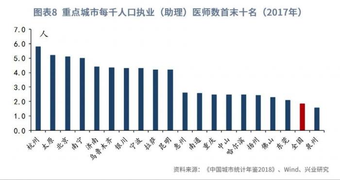 而从更为重要的每千人口执业(助理)医师数来看,杭州、北京、济南、宁波等四个东部重点城市排名进入前十,其他前十城市主要为中西部地区省会城市。整体来看,除泉州外,其他城市在每千人口执业(助理)医师数的数据表现上均超过全国平均水平。且中西部城市在该项数据上,普遍超过了东部城市。