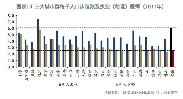 在三大城市群区域,从总量上看,核心城市在总量上均明显高于周边城市;从人均医疗资源看,杭州、北京延续了总量上的优势,其他核心城市的人均医疗资源数据一般;浙江各市的人均医疗资源数量普遍高于其他对比城市,整体配比较为合理;而珠三角的周边城市无论是总量还是人均医疗资源均较为紧张。