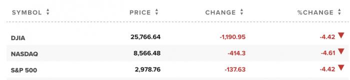 当地时间2月27日,由于美国出现首例病源不明的新冠肺炎确诊患者,以及新冠肺炎疫情在全球蔓延,美股“血流成河”,道指跌近1200点,创历史最大跌幅,标普500指数自去年十月来首次以低于3000点收盘。截至收盘,道琼斯工业平均指数跌4.42%,报25766.64点;纳斯达克综合指数跌4.61%,报8566.48点;标普500指数跌4.42%,报2978.76点。