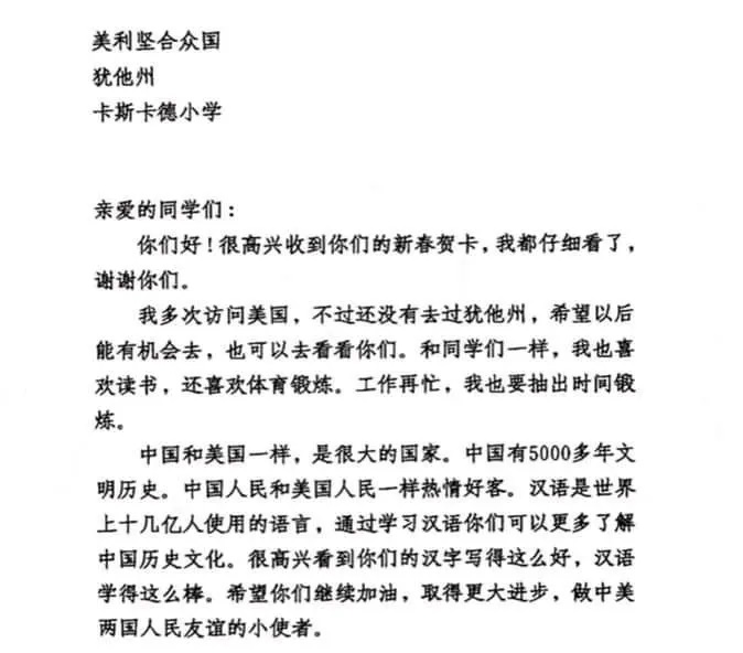 习近平还在信中说,我多次访问美国,不过还没有去过犹他州,希望以后能有机会去,也可以去看看你们。和同学们一样,我也喜欢读书,还喜欢体育锻炼。工作再忙,我也要抽出时间锻炼。