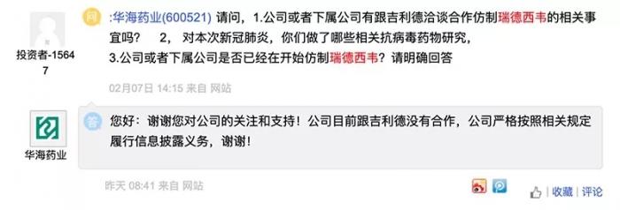 2月7日,有投资者向华海药业提问,咨询其公司或下属公司是否有跟吉利德洽谈合作仿制药瑞德西韦事宜,并已经在开始仿制瑞德西韦。对此,华海药业回复称,目前跟吉利德没有合作,公司严格按照相关规定旅行信息披露义务。2月5日,华海药业收涨8.36%,2月6日,收涨10%。