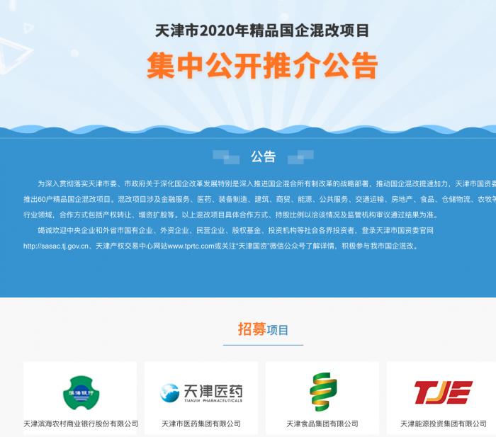 近期,天津产权交易中心官网发布天津市2020年精品国企混改项目集中公开推介公告。