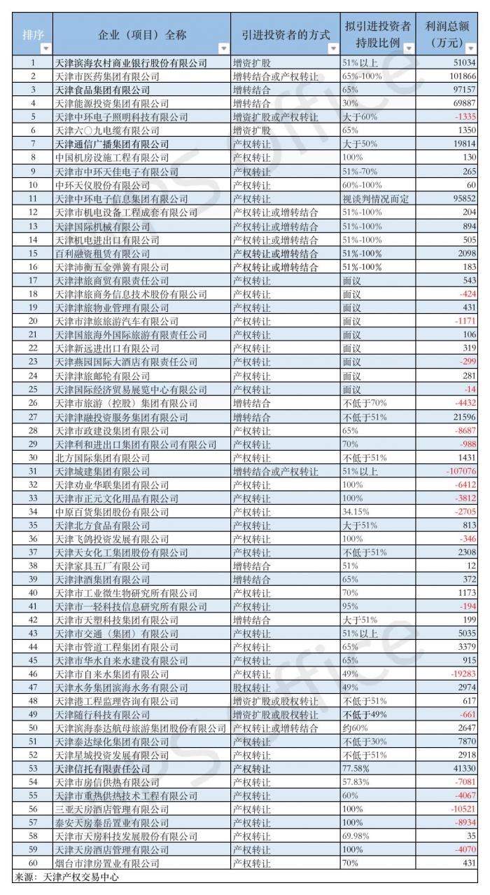 21世纪经济报道查阅发现,参与混改的企业中有天津滨海农商行、百利融资租赁、天津信托等金融机构,均出让50%以上的股权。