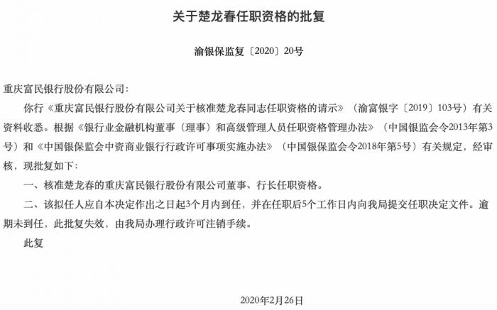 21世纪经济报道记者查阅重庆银保监局官网发现,3月2日,重庆银保监局批复,核准楚龙春的重庆富民银行股份有限公司董事、行长任职资格。