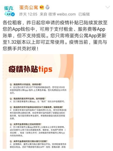 3月2日,“蛋壳公寓”微博发布消息称,租客申请的疫情补贴已陆续发放至租客App钱包中,可用于支付租金、服务费等App账单,但不支持提现。