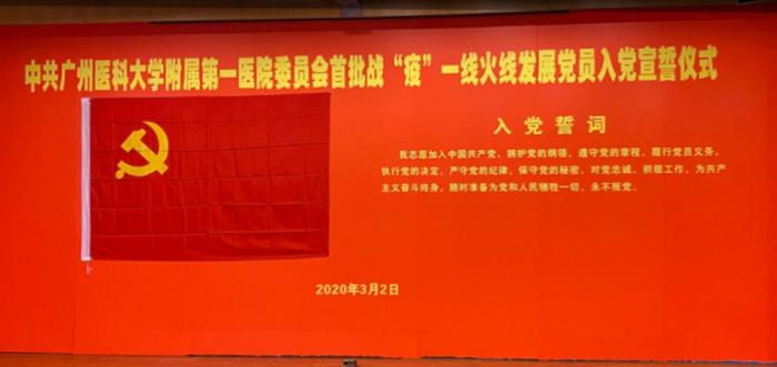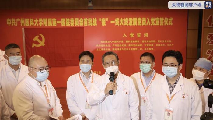 “我志愿加入中国共产党,拥护党的纲领……”在钟南山院士和广州医科大学附属第一医院党委书记黎毅敏的领誓下,广州医科大学附属第一医院的重症医学科副主任医师徐永昊、内分泌科驰援武汉汉口医院护士李颖贤两名同志分别在广州和武汉进行了入党宣誓。