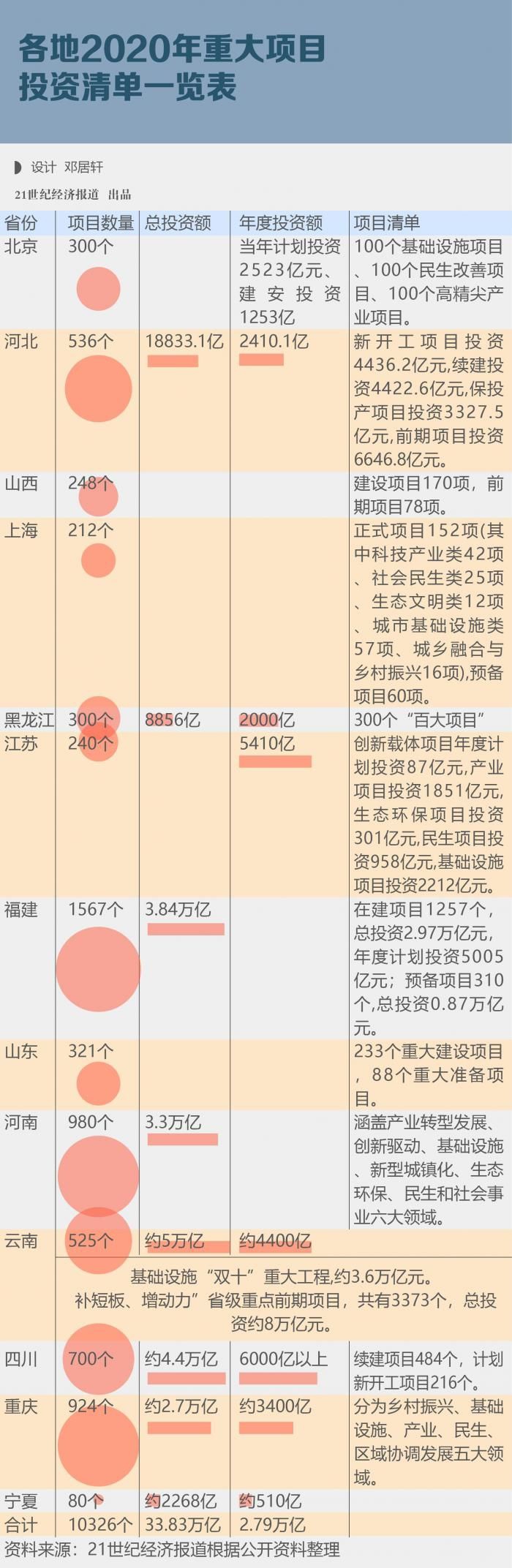 截至2020年3月1日,北京、河北、山西、上海、黑龙江、江苏、福建、山东、河南、云南、四川、重庆、宁夏等13个省市区发布了2020年34万亿的重点投资项目。